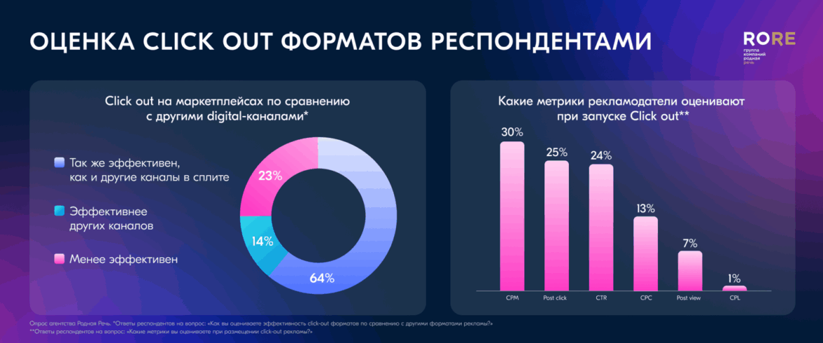Согласно данным опроса «Родной речи», 64% респондентов считают, что click-out на маркетплейсах так же эффективен, как и другие каналы digital, а 14% — что он эффективнее других каналов.