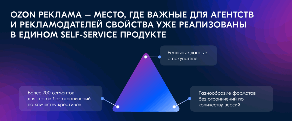 Руководитель отдела операционного сопровождения и продуктового развития «Озон» Маргарита Бондарь: «Для “Озон” рекламный треугольник является равносторонним. Сумма углов составляет 180 градусов, все углы по 60 градусов. Все составляющие важны. Важно, чтобы современная площадка ритейл-медиа совмещала в себе все эти стороны. Первое — инвентарь, реальные данные о наших покупателях. Второе — таргет, разнообразие форматов без ограничений по количеству версий. Третье — креатив. Более 700 сегментов для текстов без ограничений по количеству креативов».