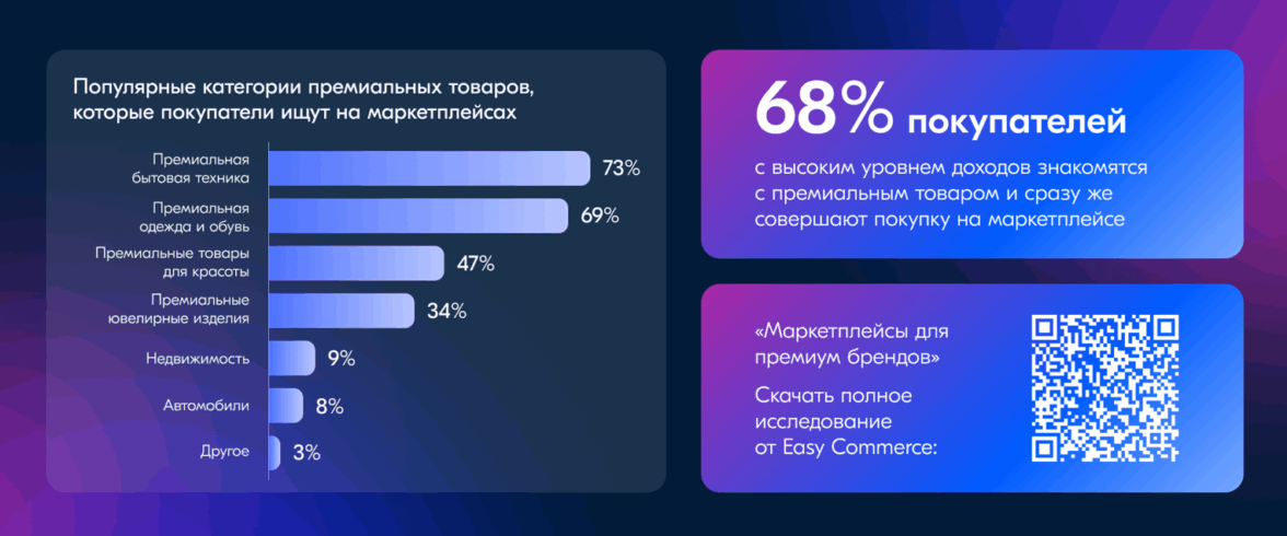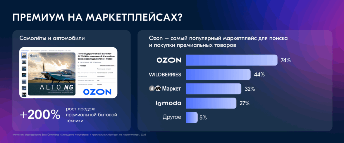 С этой ЦА было связано второе исследование, проведенное Easy Commerce в 2025 году — «Отношение покупателей к премиальным брендам на маркетплейсах». Согласно этому исследованию, «Озон» — самый популярный маркетплейс для поиска и покупки премиальных товаров. Согласно представленным цифрам, 74% респондентов для покупки премиум-товаров чаще рассматривают «Озон», 44% — Wildberries, 32% — «Яндекс.Маркет», 27% — lamoda, 5% — другие площадки. Самые популярные категории премиальных товаров — бытовая техника (73%), одежда и обувь (69%), товары для красоты (47%), ювелирные изделия (34%).