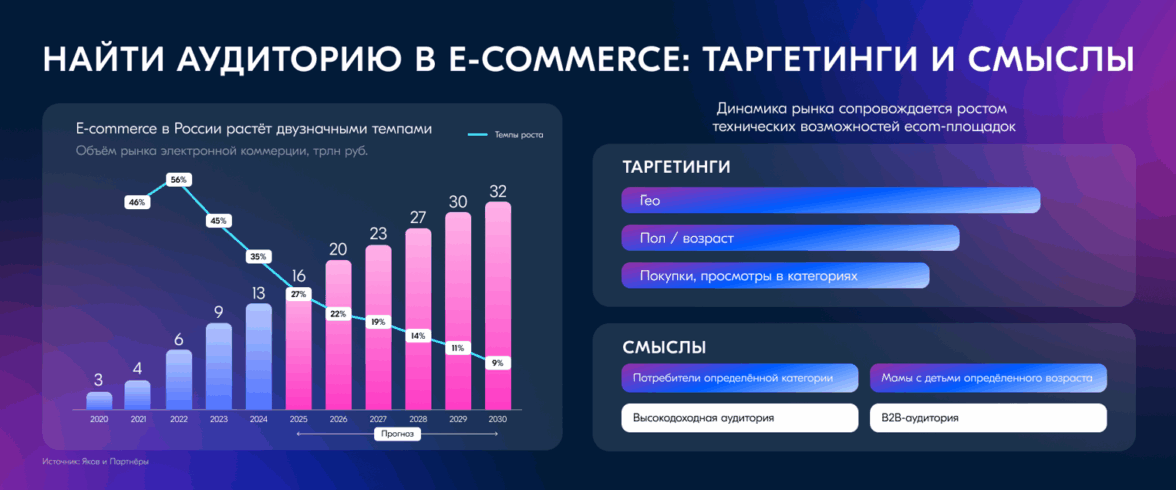 Коммерческий директор Easy Commerce Григорий Богачев поделился результатами двух исследований. Результаты исследования «Яков и партнеры» показывают, что рынок e-commerce в России растет двузначными темпами. В 2025 году — 16% роста, объем рынка — 16 трлн рублей. Прогноз на 2030 год: рост на 9% и удвоение объема — до 32 трлн рублей. Растут и технические возможности e-com-площадок — к таргетингу по географии, полу и возрасту, как уже отмечала в своем выступлении Анастасия Беккер, добавляется таргетирование по покупкам и просмотрам товаров в разных категориях. Оптимизация сегментов таргетинга дает возможность выделять такие категории, например, как мамы с детьми определенного возраста. Или высокодоходную аудиторию.