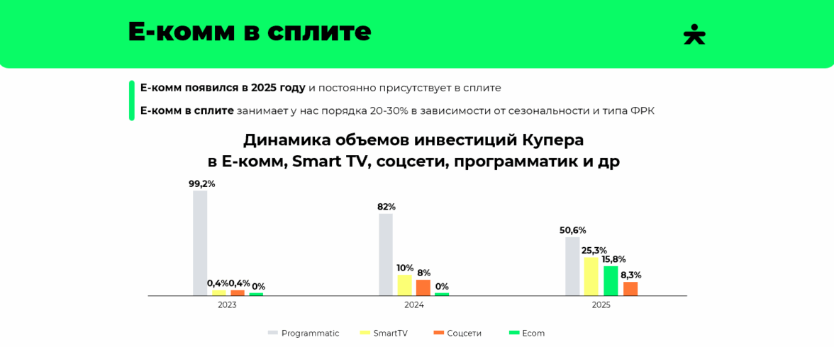 Руководитель отдела медиакоммуникаций «Купер» Артем Аманов рассказал о работе со сплитом. Анализ знаний — через BHT (12 штук в месяц) и BL (девять централизованных за год). Для анализа бизнес-показателей используется эконометрика, аналитика на Stable ID, post-view атрибуция через связку по кукам, ID и IP; когортные данные по привлеченным клиентам. В 2025 году в сплите «Купер» появился и стал постоянно присутствовать e-com, занимая 20–30% в зависимости от сезонности и федеральных рекламных кампаний. Презентацию Артем Аманов закончил популярной присказкой «Купер доставка супер».