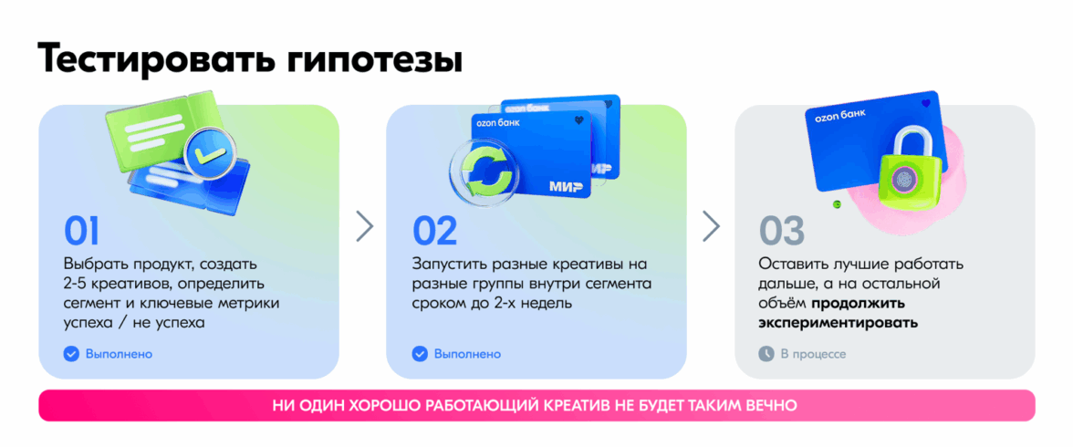 Как утверждает руководитель направления маркетинговых коммуникаций Озон-банка Анна Резчикова, работа с креативом — процесс постоянного совершенствования. Креативов в Озон-банке много — больше 20 продуктов размещаются в канале Ozon Performance, ежемесячно запускаются более 40 кампаний, одновременно размещаются более 350 баннеров. Для того, чтобы оптимизировать работу с подобными объемами, Анна Резчикова предлагает создать конструктор баннеров и тестировать гипотезы.