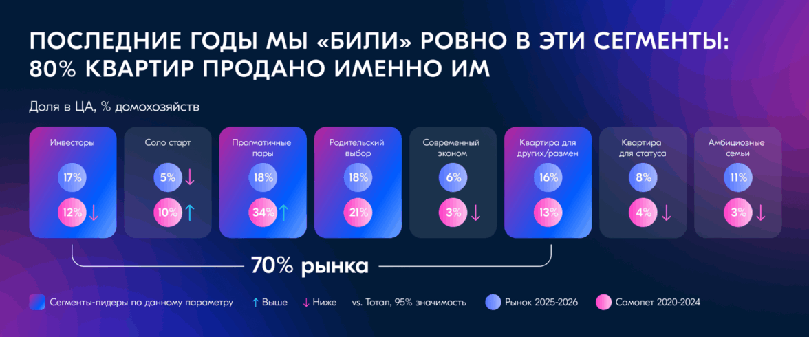 На основе полученных данных были выделены сегменты целевой аудитории, которым были присвоены описания. Выяснилось, что 70% рынка занимают четыре самых емких сегмента: «прагматичные пары» (18%), «родительский выбор» (18%), «инвесторы» (17%), «квартира для других/размен» (16%). Эти цифры во многом совпали с клиентами ГК «Самолет» — в 2020–2024 годах 80% квартир было продано представителям этих четырех категорий.