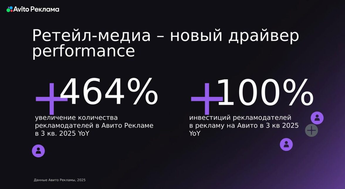 Директор «Авито Реклама» Яков Пейсахзон представил динамику платформы в третьем квартале 2025 года: число рекламодателей выросло на 464% год к году, а инвестиции в рекламу удвоились, что обусловлено эффектом низкой базы и запуском собственного рекламного кабинета. Эксперт позиционирует ритейл-медиа как новый драйвер performance-маркетинга, подчеркивая значительный потенциал роста и привлекательность платформы для рекламодателей.