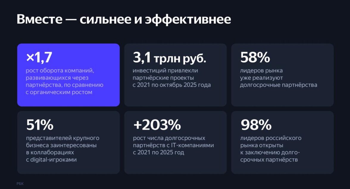Директор по работе с агентствами и партнерами «Рекламной сети «Яндекса»» (РСЯ) Виктория Кинаш на НРФ представила результаты совместного исследования «Яндекса» и РБК. По результатам, 98% компаний открыты к долгосрочным партнерским таким взаимодействиям, при этом 58% уже имеют подобные соглашения. С 2021 по октябрь 2025 года партнерские проекты привлекли 3,1 трлн рублей инвестиций, а число долгосрочных партнерств с IT-компаниями выросло на 203%. 51% крупного бизнеса заинтересованы в коллаборации с digital-игроками.