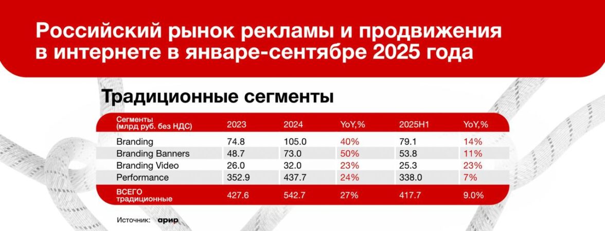 Наиболее динамично развивался формат branding video, который вырос на 23% и достиг 25,3 млрд рублей. Branding banners в январе-сентябре составили 53,8 млрд рублей с ростом на 11%. Президент АРИР Борис Омельницкий отметил семиквартальное замедление роста, но подчеркнул, что надеется на позитивные изменения в четвертом квартале.