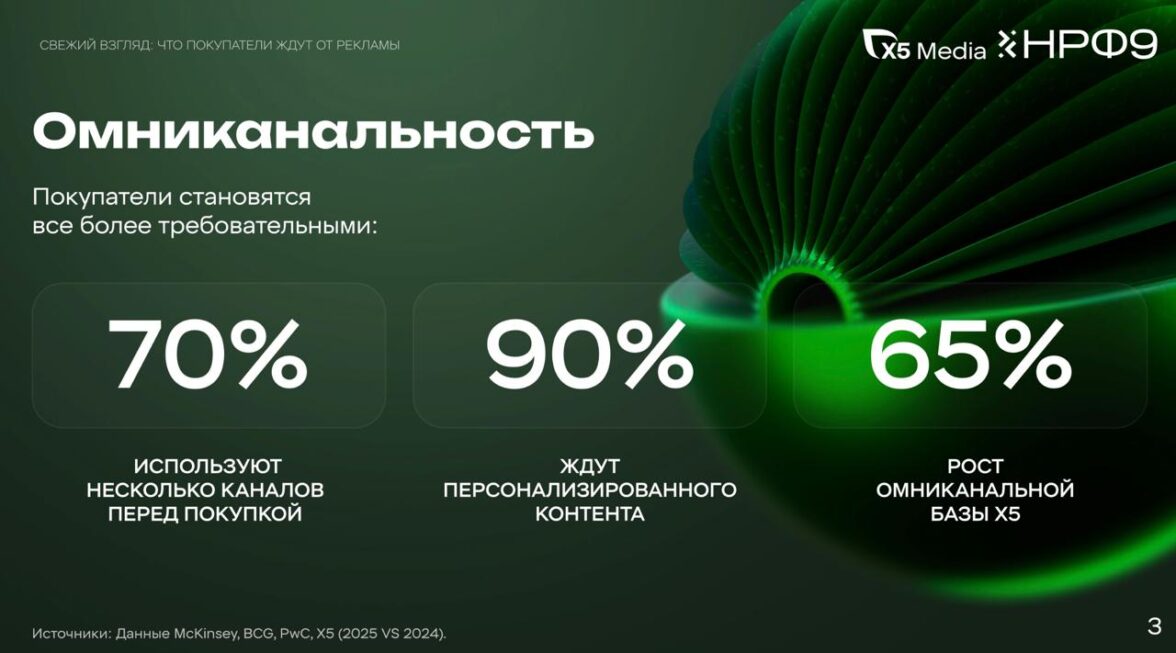 Коммерческий директор X5 Media Олеся Чечик представила сравнительный анализ современного покупательского поведения на базе данных программы лояльности, охватывающей 92 млн человек. Ежедневно 25 млн покупателей совершают покупки в офлайн-магазинах и 5 млн — в онлайне, при этом доступно более 1,5 тыс. рекламных сегментов. Ключевой портрет современного покупателя — омниканальник: 70% используют несколько каналов перед покупкой, 90% ожидают персонализированного контента, а в городах с населением до 500 тыс. магазины X5 становятся центром притяжения.