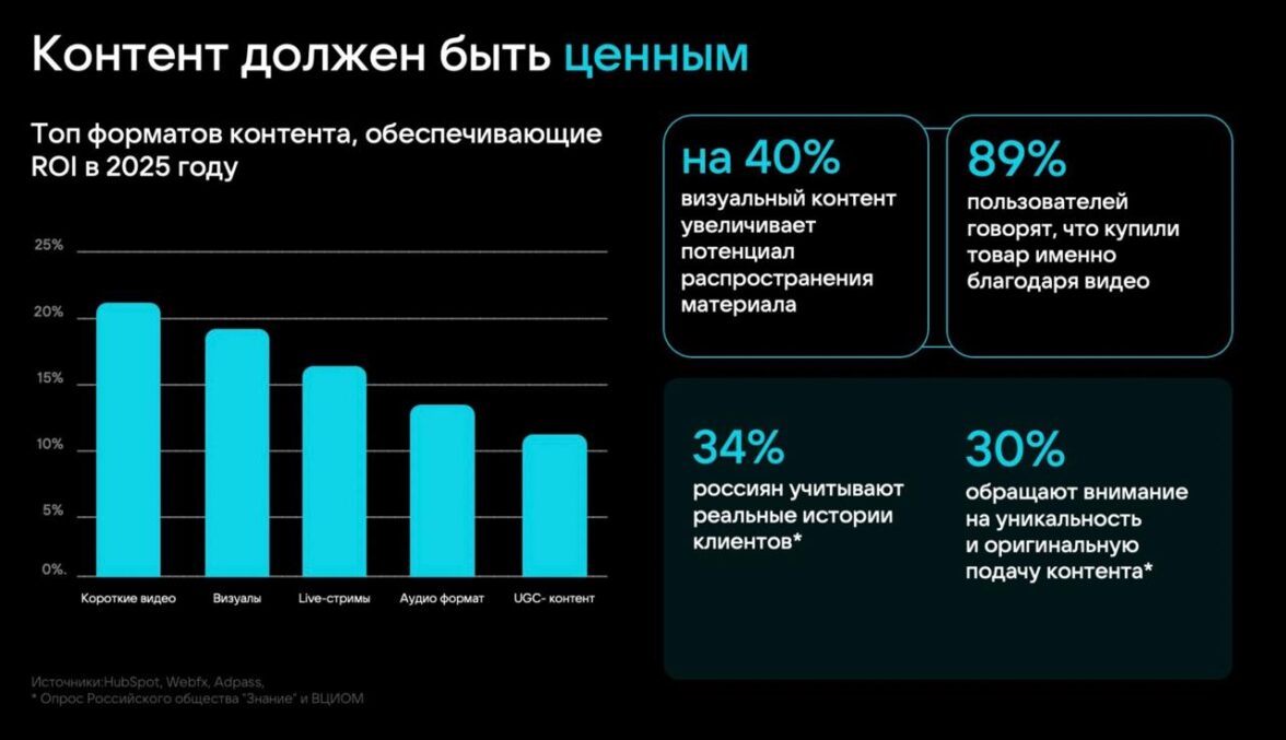 Директор по работе с партнерами VK Мария Добромильская представила новую бизнес-модель, основанную на трех ключевых составляющих: контенте, сообществе и коммерции. В области контента главенствует видео: 89% пользователей признались, что совершили покупку благодаря видеоконтенту, при среднесуточном просмотре «VK Видео» в 3,3 млрд. Особый акцент сделан на коротких роликах как новом тренде, требующем от брендов более тонкого и целевого подхода к созданию контента.