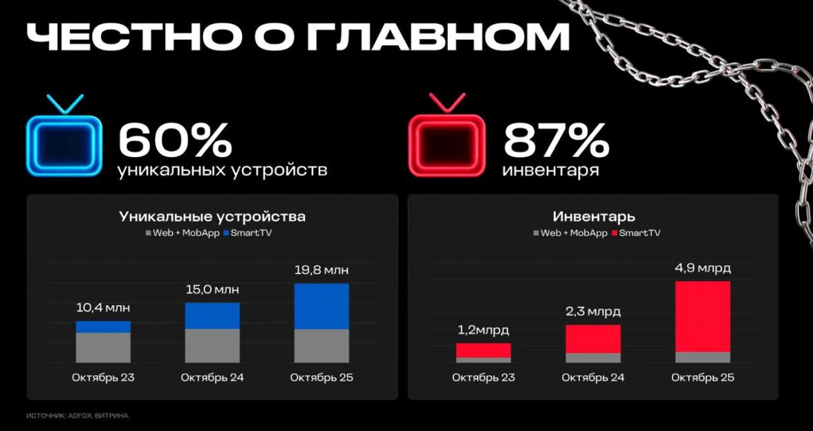 Директор по рекламным продуктам селлера «Эверест» Вадим Гречишкин представил анализ роста рекламного рынка через призму трех ключевых факторов: населения, доверия и измерений, подчеркнув, что доверие между всеми участниками рынка — от рекламодателя до клиента — является определяющим. На примере продуктов «Национальной Медиа Группы» (НМГ) он отметил значительную динамику роста стримингового инвентаря: за два года охват вырос с 10,4 млн до 19,8 млн уникальных устройств, причем 60% приходится на большие экраны. Максимальная емкость показов увеличилась вчетверо — с 1,2 млрд до 4,9 млрд.