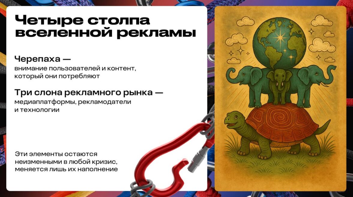 Три слона это медиаплатформы (ритейлеры Х5 и «Магнит», Т-банк и Альфа-банк, телеком-операторы), рекламодатели (активизация «молчунов» на российском рынке, сохранение рынка недвижимости, завершение товарных остатков у китайских автопроизводителей) и технологии (big data, anti-fraud и искусственный интеллект). Ключевой посыл эксперта: для роста «слоникам» необходимо чутко улавливать изменения на рынке, представленном «черепахой».