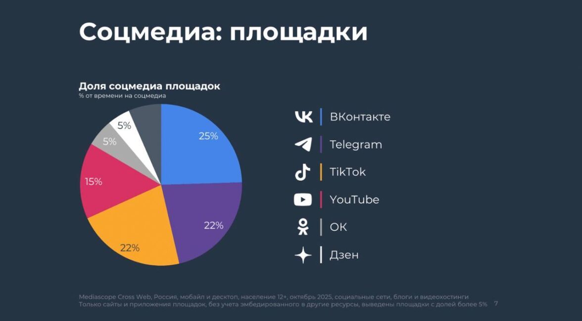 Распределение активности различается по возрастным группам: начиная с 18-24 лет снижается время, проводимое в соцмедиа, и увеличивается время на другие сервисы, а после 55 лет вновь растет интерес к социальным медиа. В октябре 2025 года доли ведущих платформ распределились следующим образом: «ВКонтакте» — 24%, Telegram и TikTok — по 22% времени. При этом 72% пользователей Telegram читают телеграм-каналы, во всех возрастных группах сохраняется высокий интерес к новостным каналам.