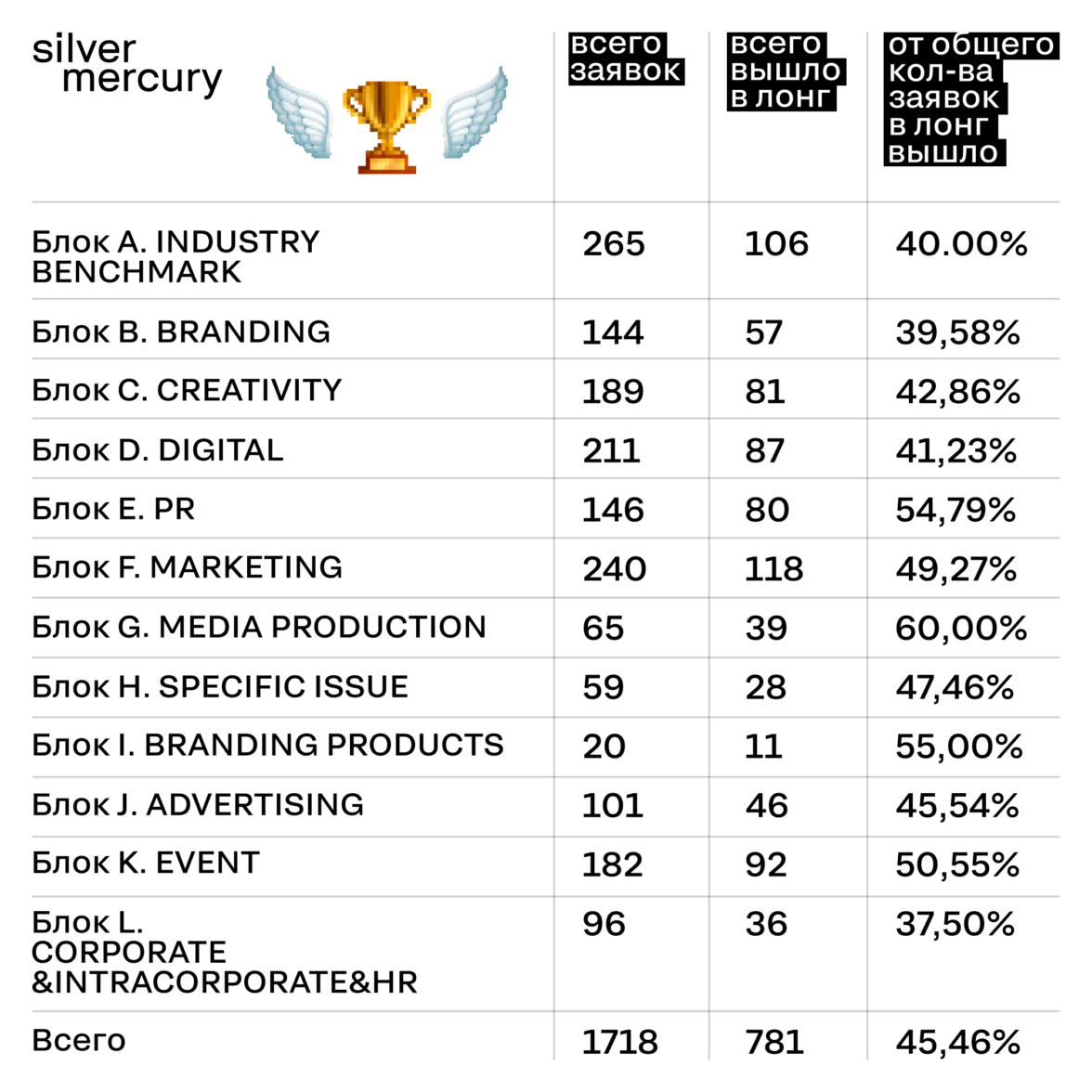 С 3 по 6 июня в Москве прошла церемония награждения Silver Mercury Awards — одной из ключевых профессиональных премий в области рекламы, маркетинга, PR и digital. XXVI сезон стал рекордным по количеству заявок и ужесточению отбора: из 1718 работ лишь 54 получили золото. Это 3,14% — самый низкий показатель за всю историю премии и одновременно маркер по-настоящему высокой планки качества.
