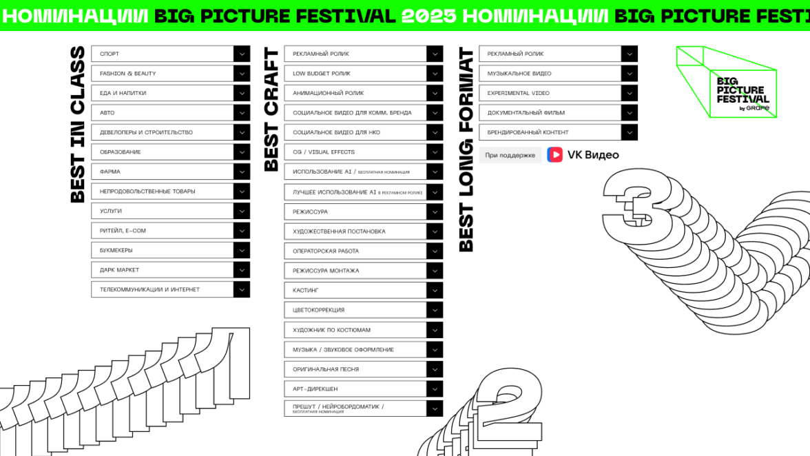 В 2025 году фестиваль станет еще масштабнее, сохраняя миссию — создавать новые стандарты на рынке видеопроизводства, делая индустрию прозрачнее, и объединять лучших. Big Picture награждает профессионалов отрасли и открывает новые имена.