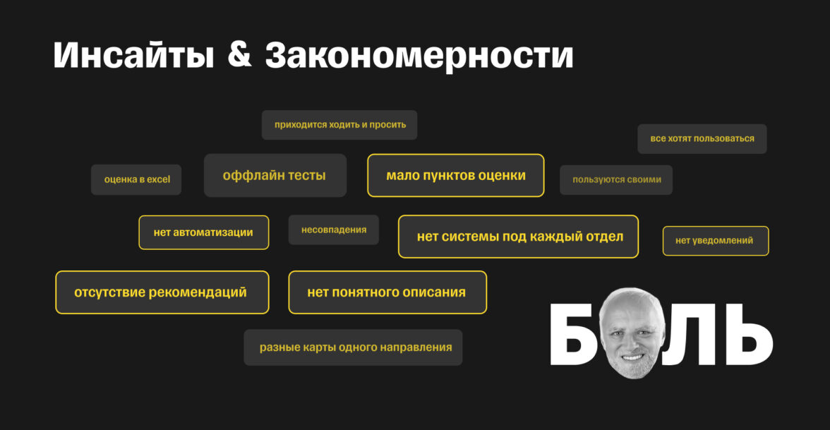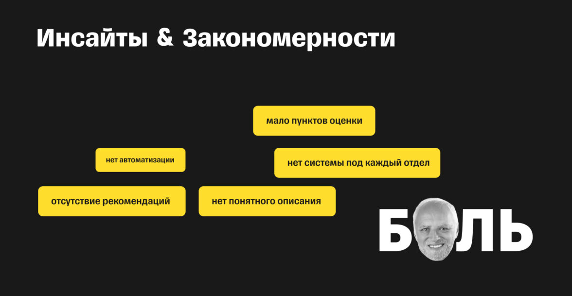 Какие боли повторяются чаще всего? Мало пунктов оценки, нет автоматизации (вся работа идет через excel), нет отдельной системы под каждый отдел, нет рекомендаций по развитию навыков, нет понятного описания к каждому навыку.