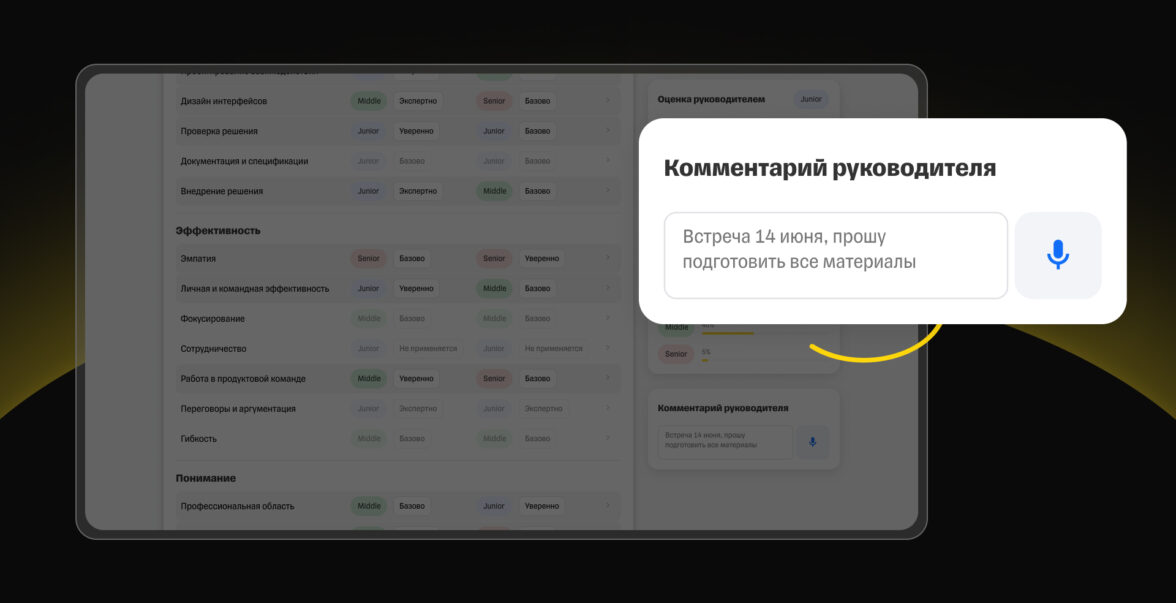 4. Добавляем руководителю возможность оставлять комментарии и записывать их голосом с транскрибацией в текст. Возможность комментариев делает сервис более прозрачным и предлагает моментальную обратную связь. Так руководителю не приходится много писать, а сотруднику понятнее, почему тимлид оценил его именно таким образом.