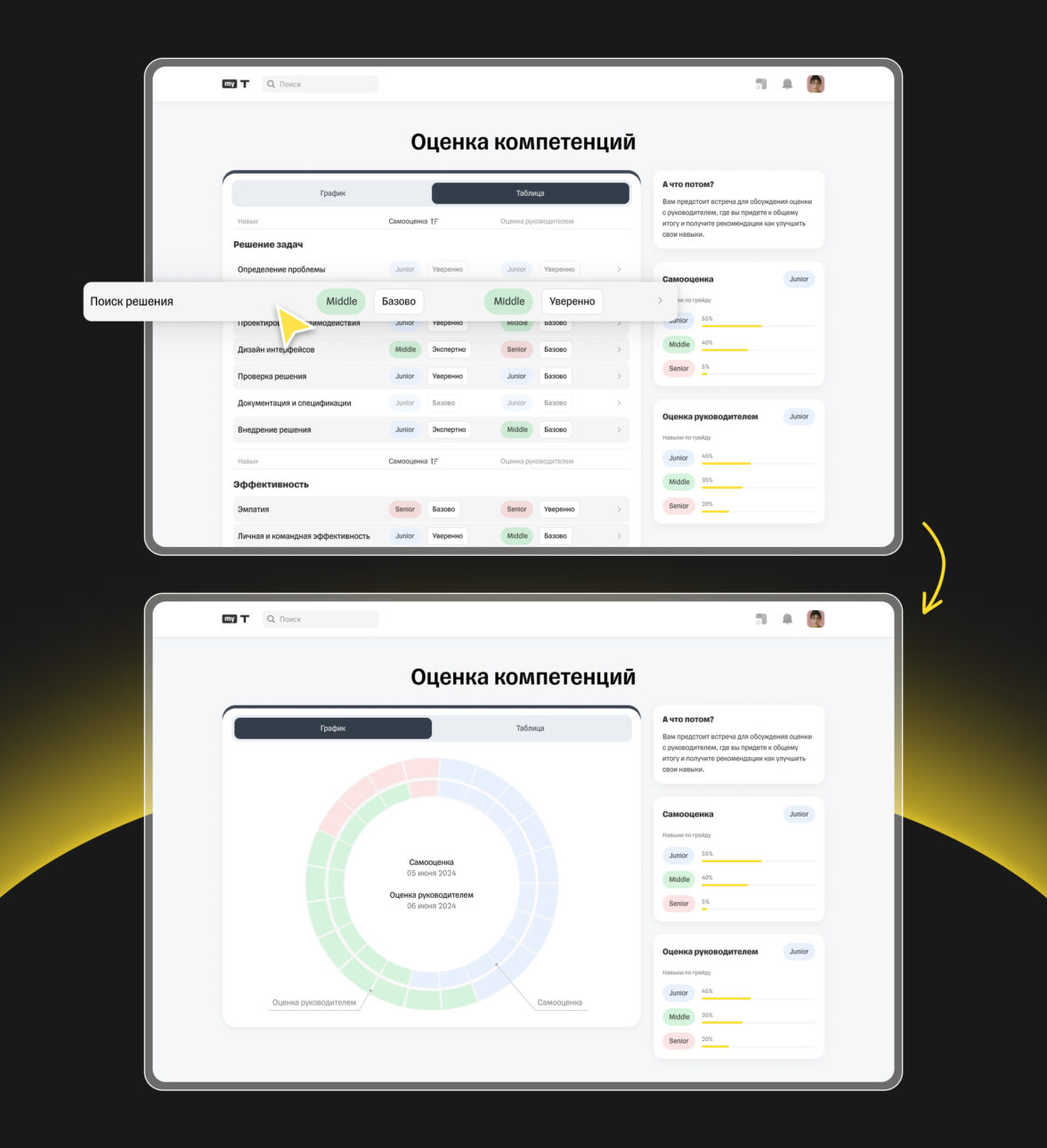 После проставления всех навыков в столбце самооценки пользователь видит выбранные им оценки. Исходя из проставленных оценок, справа будет отображаться уровень грейда сотрудника и его прогресс в других грейдах.