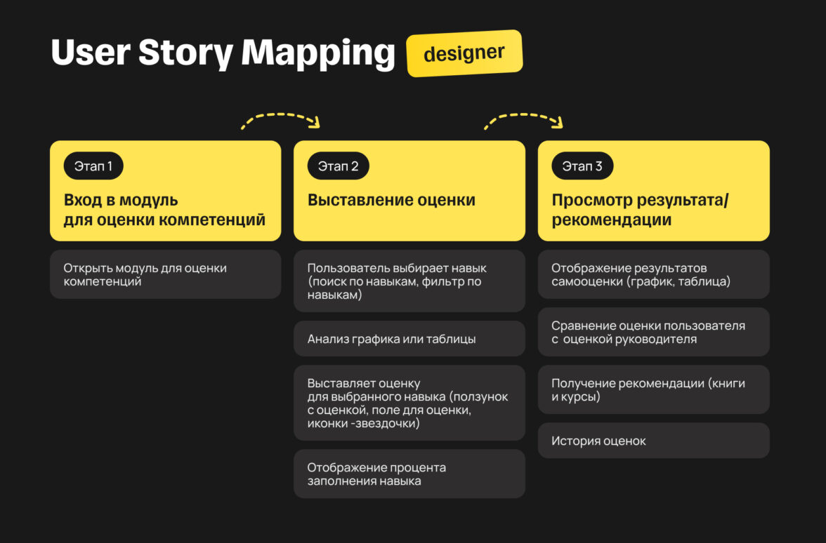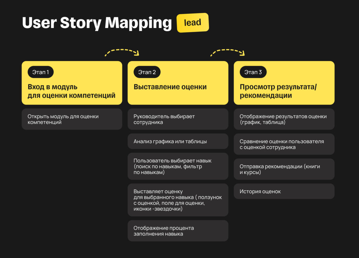 Делаем визуализацию пользовательских историй (User Story Mapping), чтобы заложить фундамент в проектировании UX. Определяем шаги, которые будут проходить пользователи, и основные приоритеты для ранней версии продукта (mvp).