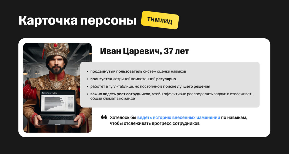 А это — тимлид Иван Царевич. Ему хотелось бы видеть историю изменений по навыкам, чтобы отслеживать прогресс сотрудников