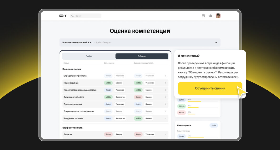 Шаг 4. После обсуждения оценок с сотрудником руководитель может скорректировать свои оценки. Далее он нажимает кнопку «Объединить оценки» в боковой панели. Итоговые оценки по умолчанию будут теми, что поставил руководитель. После этого в боковой панели сотрудник может увидеть навыки, которые ему нужно прокачать, со ссылкой на базу знаний.