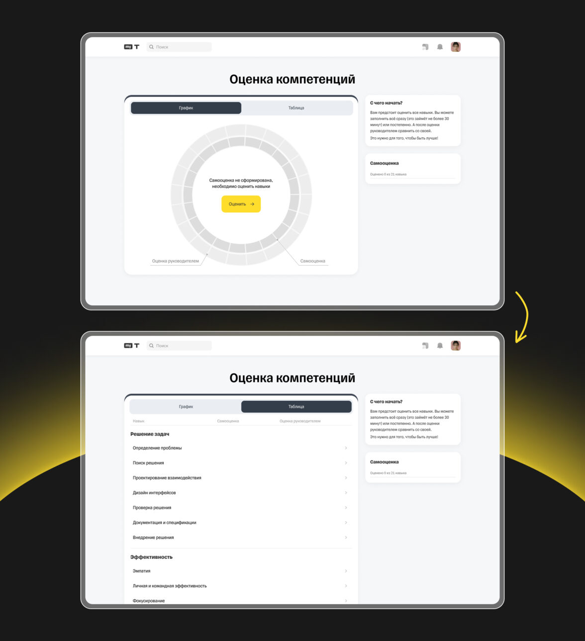 Шаг 1. Пользователя встречает первый экран с графиком навыков, который предстоит заполнить. Здесь есть подсказка, где будет отображаться оценка сотрудника и руководителя, и яркая заметная кнопка с переходом ко всему списку навыков.
