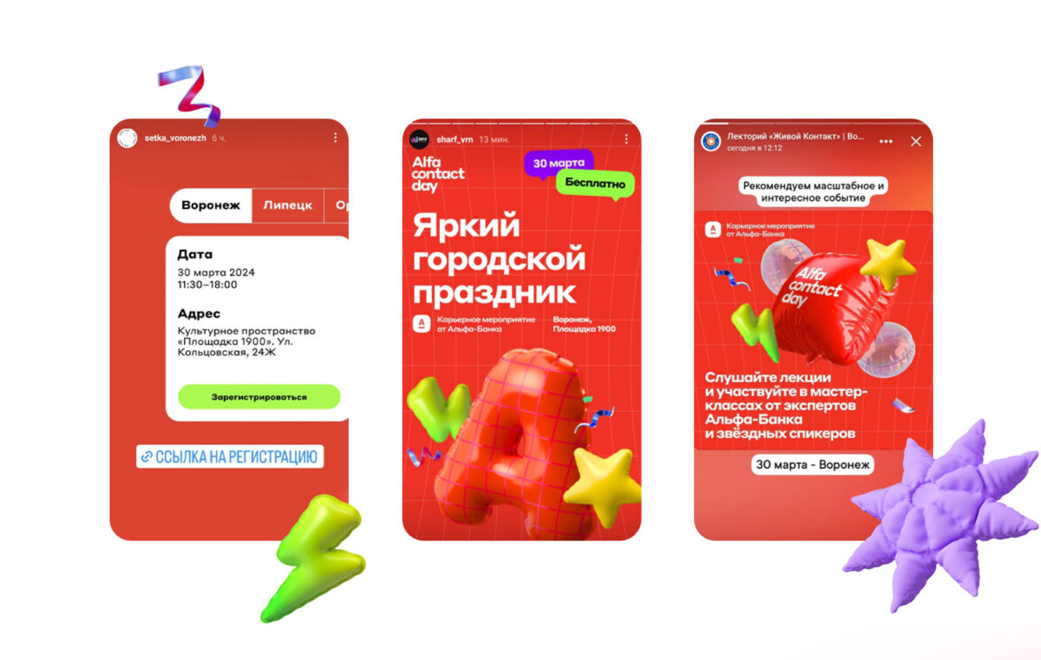 На Воронеж и Липецк (мы продвигали событие только в этих городах) давалось по 4 недели. Альфа-Банк поставил нам задачу — получить 1000 регистраций и собрать до 400 участников в каждом городе. В качестве площадок попросили использовать ВКонтакте, Telegram и Instagram*, а в качестве механик — посевы и прогревы у блогеров.