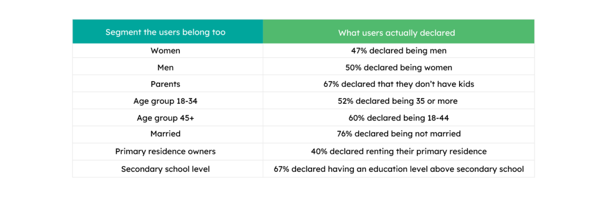 Ошибки таргетинга были также обнаружены в более узких сегментах: 40% пользователей, отнесенных к категории владельцев жилья, на самом деле являются арендаторами. 67% пользователей со средним школьным образованием сообщили, что у них есть диплом колледжа или университета.