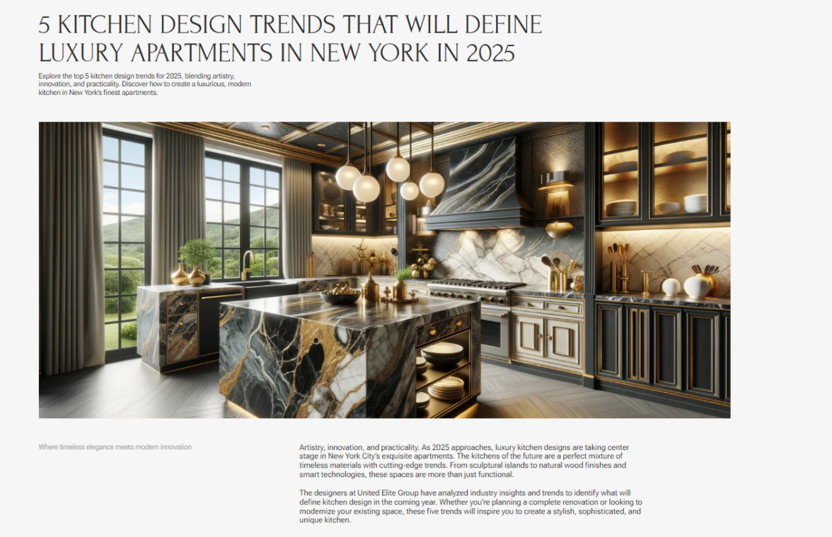 Темы статей подбираются по запросам пользователей, что делает контент релевантным и востребованным. В статье о дизайне кухни в Нью-Йорке акцент на новшества и тренды, интересующие читателей.