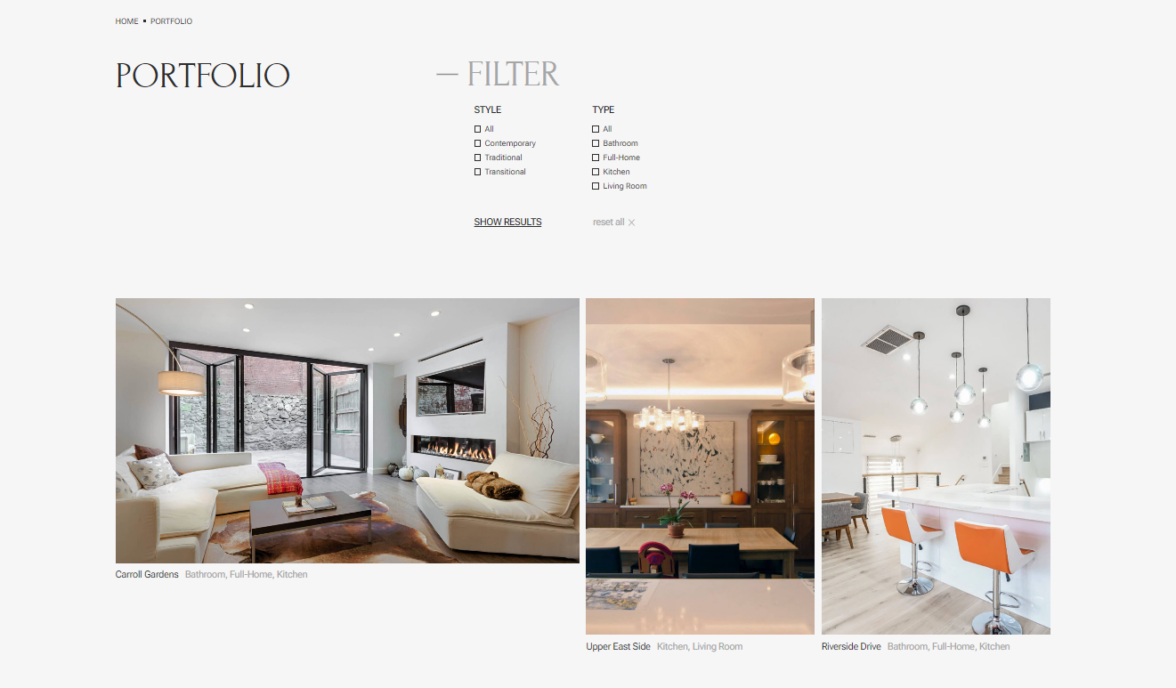 Чтобы блок портфолио стал удобным и вдохновляющим, мы сделали акцент на простоте и интуитивности взаимодействия. В первую очередь, провели анализ семантического ядра: выявили популярные направления дизайна и запросы аудитории. На основе этой информации изменили структуру портфолио, добавили фильтрацию по стилю и типу помещения, вместо тегов, чтобы пользователи могли быстрее находить нужные проекты — от изысканных кухонь до стильных гостиных.