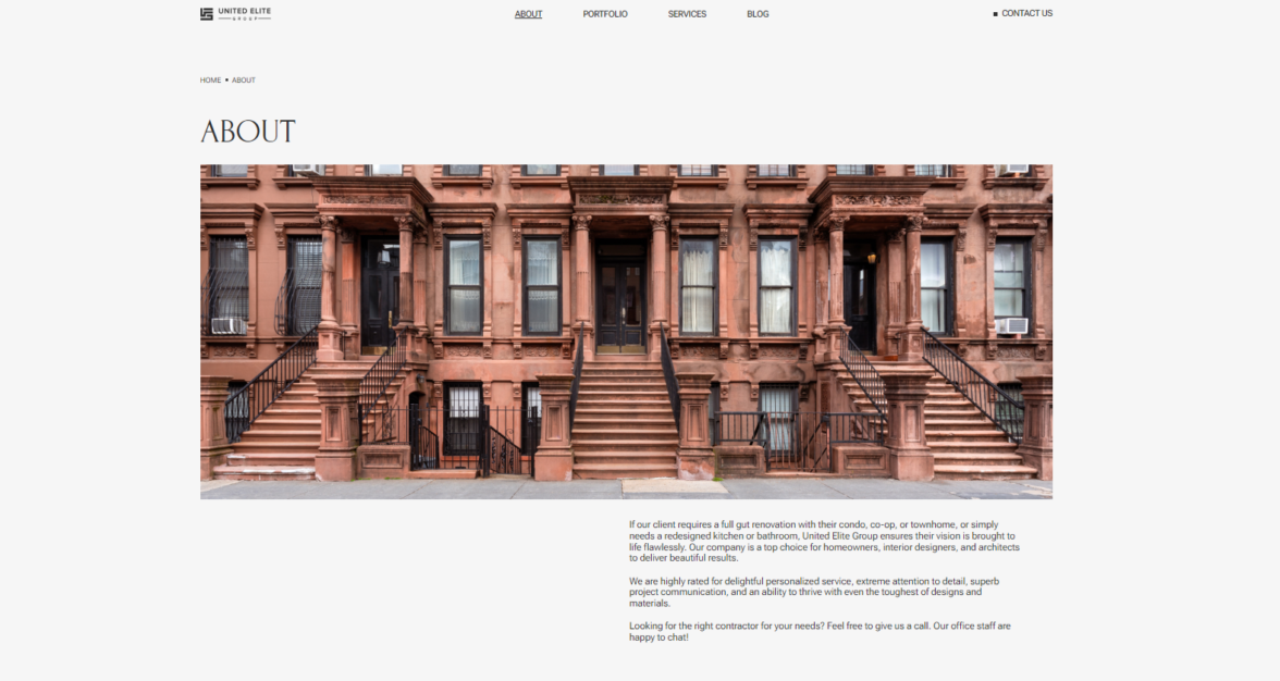 Мы создавали сайт для благосостоятельных семей и владельцев «домов мечты» в старом фонде Нью-Йорка. Особое вдохновение черпали из домов в стиле браунстоун, чьи владельцы часто обращаются за реновацией к United Elite Group.