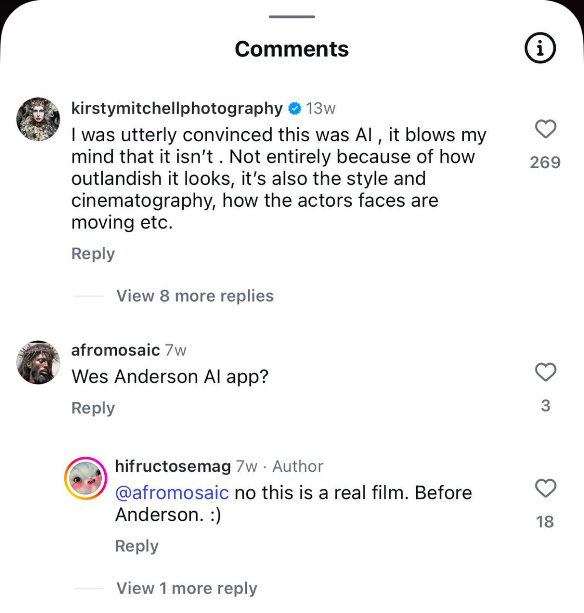 Пример — англоязычный тред с кадрами из фильма «Кин-дза-дза!». Пользователи уверены: это точно сгенерировано ИИ. Аргументы? «Слишком стилизовано», «как будто Уэс Андерсон встретил Безумного Макса», «похоже на покадровую генерацию с наложением пыли». Но, как надеемся вы знаете, это не генерация, а реальное кино. Просто эстетически чуждое современному зрителю, привыкшему к шаблонам Sora, Midjourney, Kling (и далее до бесконечности).