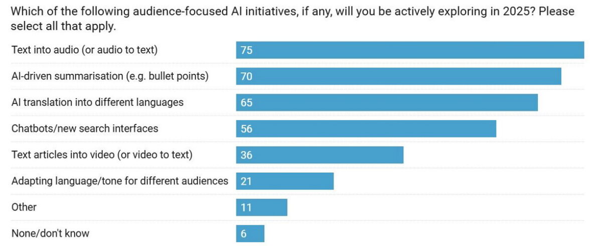 Что касается фронтэнда, то основной интерес издателей привлекают ИИ-инструменты преобразования текста в аудио (75%), инструменты реферирования (70%), перевод (65%), а также чат-боты и новые поисковые интерфейсы (56%),