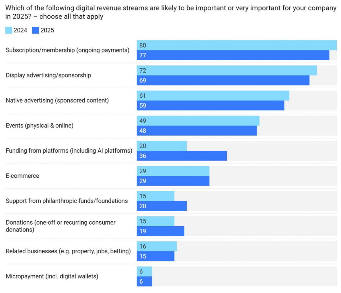 Наиболее важным источником доходов цифровых медиа 77% респондентов назвали подписки или членство, на втором месте реклама (69% опрошенных), на третьем (59%) нативная реклама (спонсорский контент).