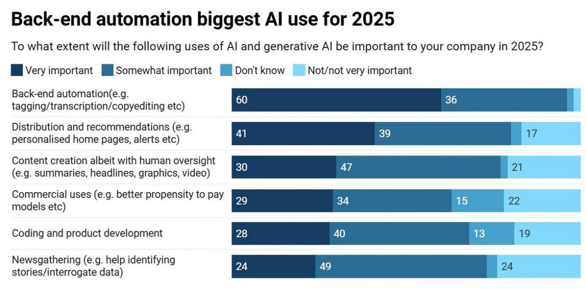 Большинство респондентов заявили, что редакции новостей частично (63%) или полностью (24%) трансформируются благодаря генеративному ИИ. Почти все опрошенные (96%) заявили, что планируют с помощью ИИ автоматизировать бэкэнд изданий, например тегирование и транскрипцию.