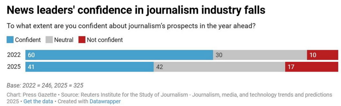 Лишь четверо из десяти (41%) опрошенных медиа-руководителей высшего звена выразили уверенность в перспективах журналистики как отрасли в 2025 году. Это меньше показателя прошлого года (47%) и 2022 года, когда оптимистично смотрели в будущее журналистики 60% респондентов.