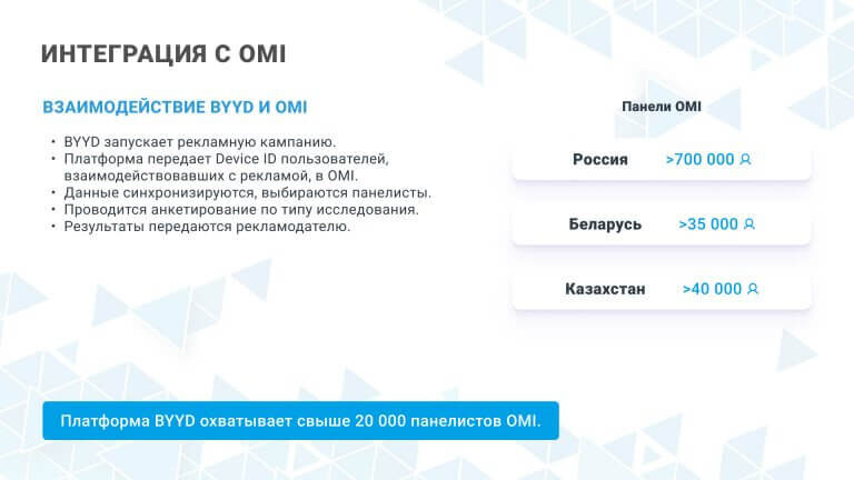 Анкетирование можно проводить самостоятельно или через специализированные платформы. Например, недавномы интегрировались с панелью OMI, которая проводит разнообразные опросы аудиторий. В том числе — исследования по узнаваемости бренда.