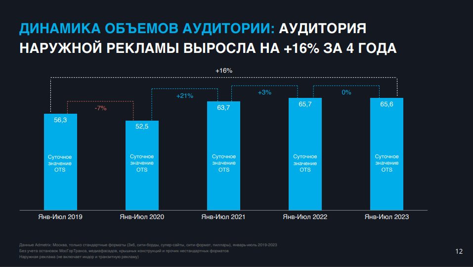 В некоторых регионах аудитория наружной рекламы растет заметно быстрее, чем у других медиа. Так, в Москве за четыре года ее объем увеличился на 14%. Рост относительно 2019 года, вероятнее всего, связан с увеличением автопарка такси и каршеринга, а также числа личных автомобилей. При этом в 2023 году суточное количество контактов с аудиторией (показатель OTS, opportunity to see) в столице осталось на уровне прошлого года.