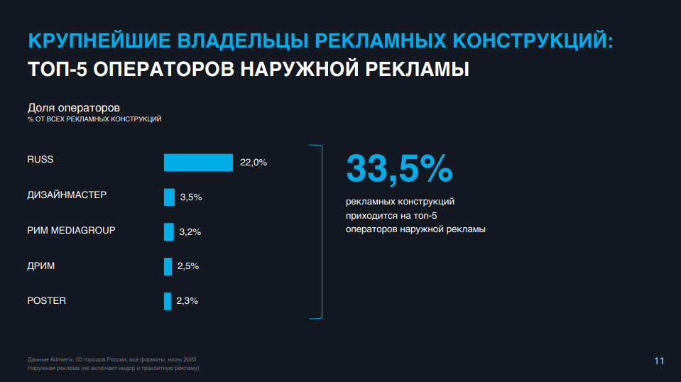 После сделки по покупке группой Russ Outdoor компании Gallery степень консолидации в сегменте возросла. На пятерку крупнейших операторов (Russ Outdoor, «Дизайнмастер», «РИМ Мediagroup», «Дрим» и Poster) теперь приходится треть конструкций. При этом Russ Outdoor владеет 22% рекламоносителей. Тем не менее, этот рынок по большей части по-прежнему фрагментирован и нуждается в стандартизации.