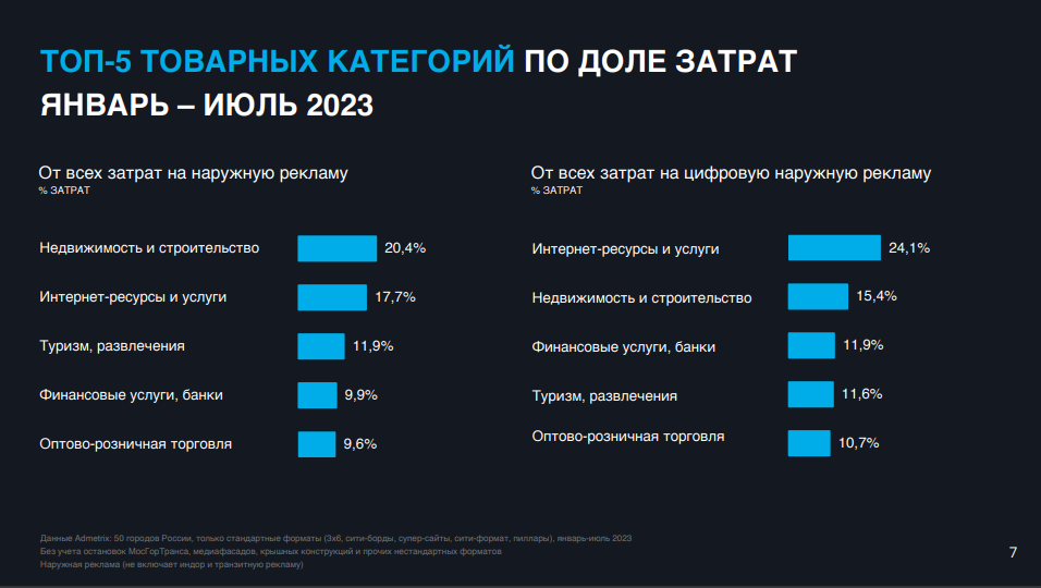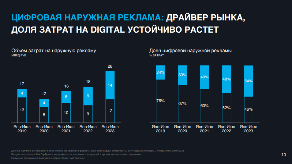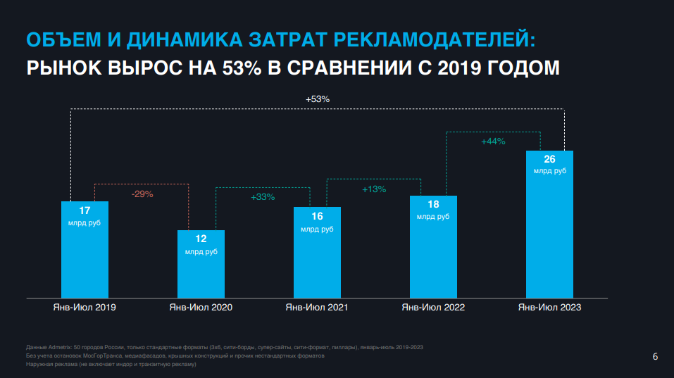 По данным Admetrix, российская наружная реклама с января по июль 2023 года выросла на 53% по сравнению аналогичным периодом 2019 года. Объем затрат рекламодателей за первые семь месяцев 2023 года составил 26 млрд рублей, что на 44% выше, чем за аналогичный период 2022 года. Между тем, по оценке комиссии экспертов Ассоциации коммуникационных агентств России (АКАР), отечественный рекламный рынок в первом полугодии увеличился на 27%.