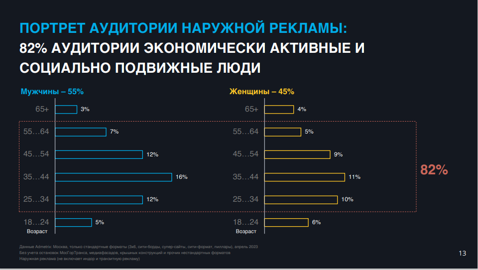 Аудитория наружной рекламы мало того, что растет, так еще и сохраняет характеристики, делающие этот коммуникационный канал привлекательным для рекламодателя. Например, 82% аудитории московской наружки — мужчины и женщины в возрасте от 25 до 64 лет, экономически активные и социально подвижные.