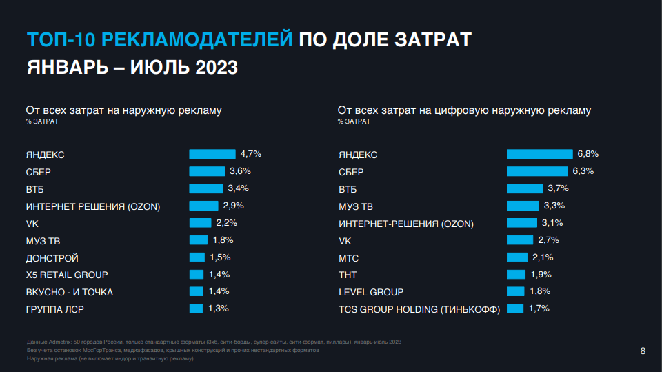 В тройке рекламодателей-лидеров по расходам нет различий между компаниями, которые размещаются на экранах и стандартных конструкциях: топ-3 остается неизменным как в сегменте цифровых носителей, так и по общим затратам — «Яндекс», «Сбер» и ВТБ.