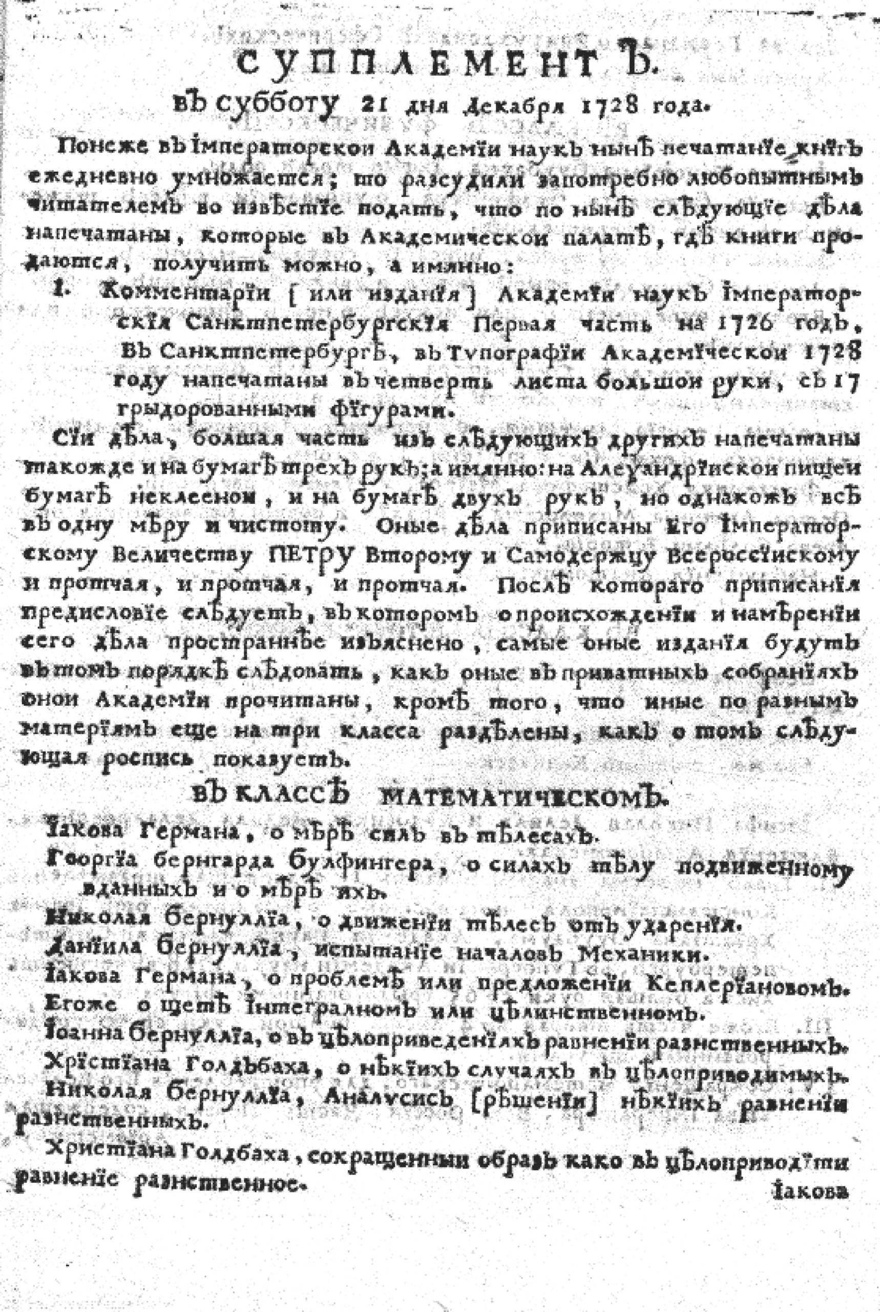 В номере от 21 декабря рекламировалось издание, которое в наши дни назвали бы «Трудами Академии Наук», напечатанное «в четверть листа большой руки, с 17 грыдорованными фигурами». В математическом разделе («классе») были опубликованы такие работы, как «О движении тел от ударения» Николая Бернулли, «Испытание началов механики» Даниила Бернулли, «О мере сил в телесах» Иакова Бергмана.