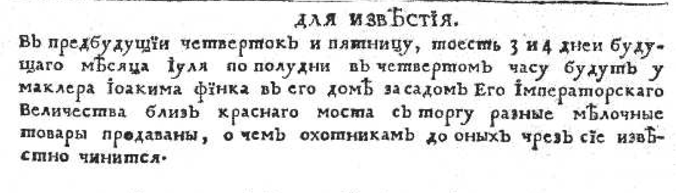 В номере от 21 июня было опубликовано первое объявление от серьезного купца, ставшего постоянным рекламодателем. Маклер Иоахим Финк сообщал, что «в среду и пятницу пополудни» в его дома «разные малые вещи с торгу продаваны будут».