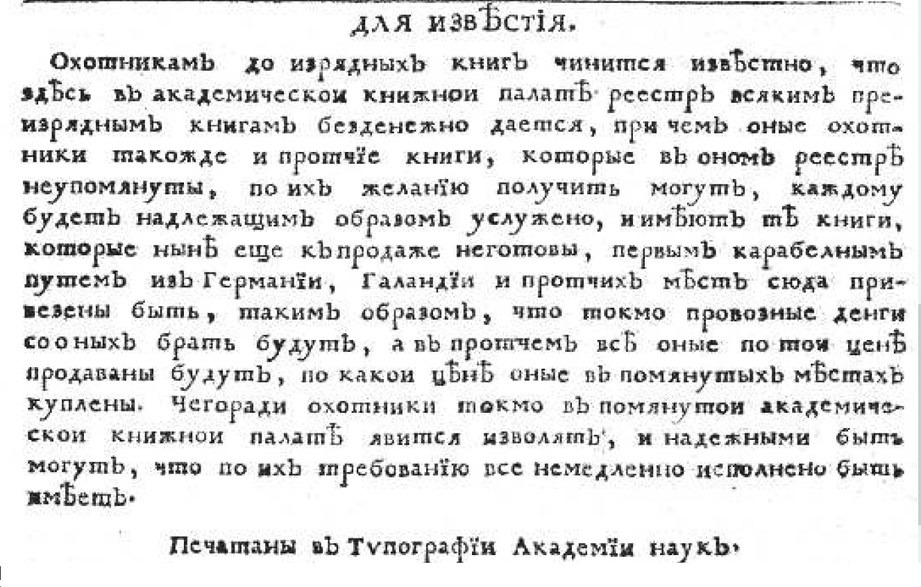 В номере от 1 марта 1729 года рекламировались изданные в типографии книги. Их «реестр» (каталог) можно было получить бесплатно. Книги, отпечатанные за рубежом, которые можно было заказать «первым карабелным путем из Германии, Галандии и прочих мест».