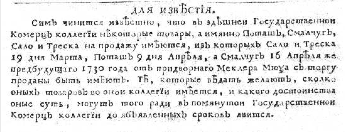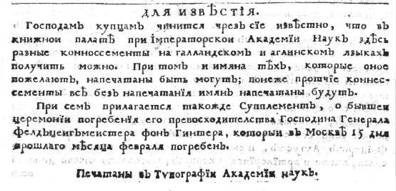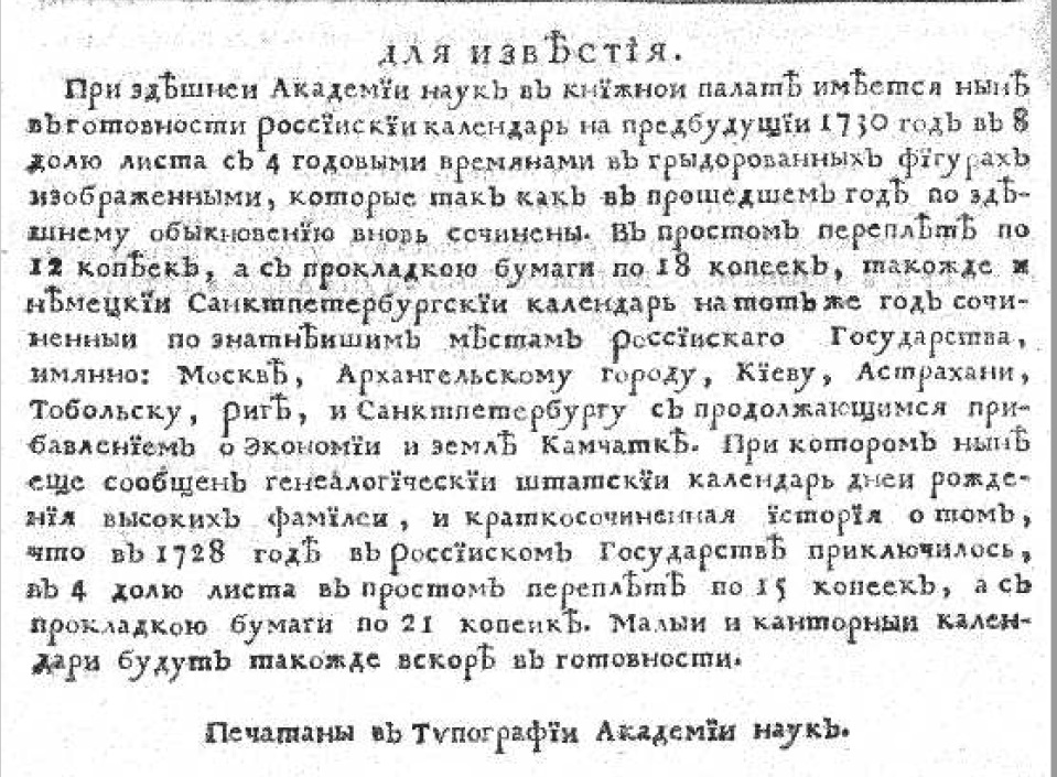 Объявления, выделявшееся в газете заголовком «Для известия», со временем публиковались все чаще. Типография продолжала рекламировать свои услуги, например, «российский календарь на предбудущий 1730 год» (12 копеек в простом переплете, 18 копеек с прокладкою бумаги) и «немецкий санктперебургский календарь» (чуть дороже — 15 копеек простой, 21 копейка с прокладкой бумаги).