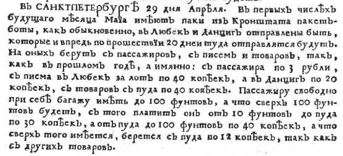 29 апреля в газете можно было прочесть объявление, не имеющее отношения к книгопечатанию. Оно извещало о начале регулярных почтово-грузопассажирских морских перевозок из Кронштадта в Любек и Данциг и о сохранении прошлогодних цен. «С пассажира — по 3 рубли, с письма в Любек за лот по 40 копеек, а в Данциг по 20 копеек, с товаров с пуда по 40 копеек».