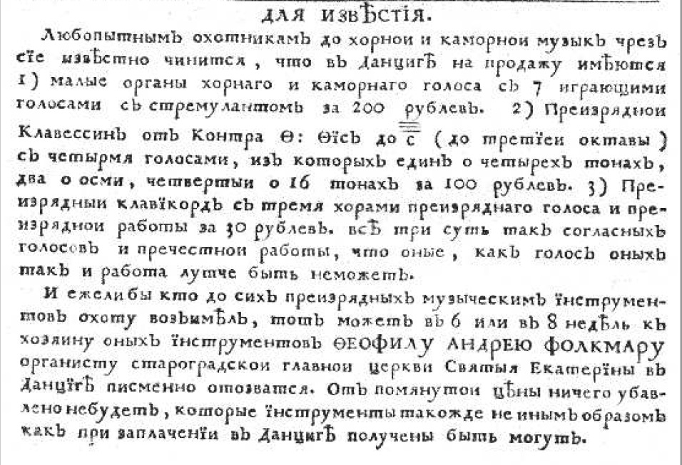 В номере от 3 июня было опубликовано частное объявление. Органист данцигской церкви святой Екатерины Феофил Андрей Фолкмар объявлял о продаже музыкальных инструментов — «малых органов хорного и каморного голоса с 7 играющими голосами со стремулантом» за 200 рублей, «преизрядного» клавесина за 100 рублей, «преизрядного» же клавикорда за 30 рублей. Продавец заявлял, что не будет снижать цену, а деньги готов получить только на месте, в Данциге.