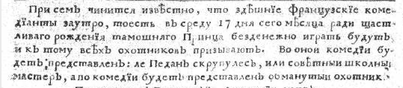 В номере от 16 сентября 1729 года была напечатана реклама из сферы шоу-бизнеса — о том, что 17 числа французские комедианты в честь дня рождения «тамошняго принца» будут играть «безденежно». Представлены были: «ле Педан скрупулес, или советный школьный мастер» и комедия «Обманутый охотник».