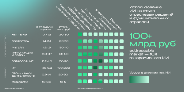 Исследования российского рынка показывают, что маркетинг и продажи — одна из главных функций применения ИИ для любой отрасли. Максимальным потенциалом для интеграции ИИ обладают сферы телеком, образование и IT. Но в целом уже становится ясно, что ни одна ключевая отрасль не обойдется без применения ИИ.