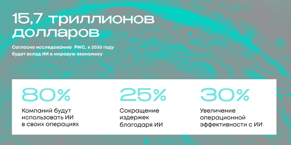 Согласно исследованию PWC, к 2030 году 80% компаний будут использовать ИИ, при этом их операционная эффективность увеличится на 30%, а издержки сократятся на 25%. Общий вклад технологии в мировую экономику исследователи прогнозируют на уровне 15,7 триллионов долларов.