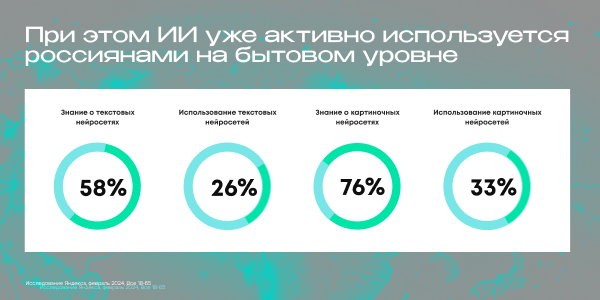 При этом стоит отметить, что внедрение ИИ идет не только «сверху» и не только в бизнесах. На бытовом уровне мы уже хорошо знакомы с ним. Например, больше половины россиян знают о текстовых нейросетях и около четверти пользовались ими. А картиночные нейросети еще более популярны — почти ¾ знают о них, и треть — использовали. Это уже очень большие цифры для столь нового инструмента, и дальше они будут только расти.